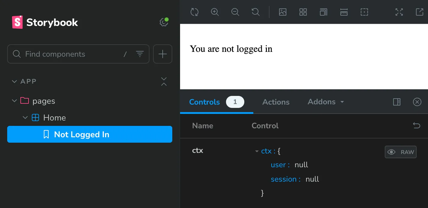 export function Home({ ctx }: RequestInfo) { return ( <div> <p> {ctx.user?.username ? `You are logged in as user ${ctx.user.username}` : "You are not logged in"} </p> </div> );}Given that this is very basic, we’d most likely want to build this out a bit more. Storybook is the perfect place to do that! Let’s see what that looks like.